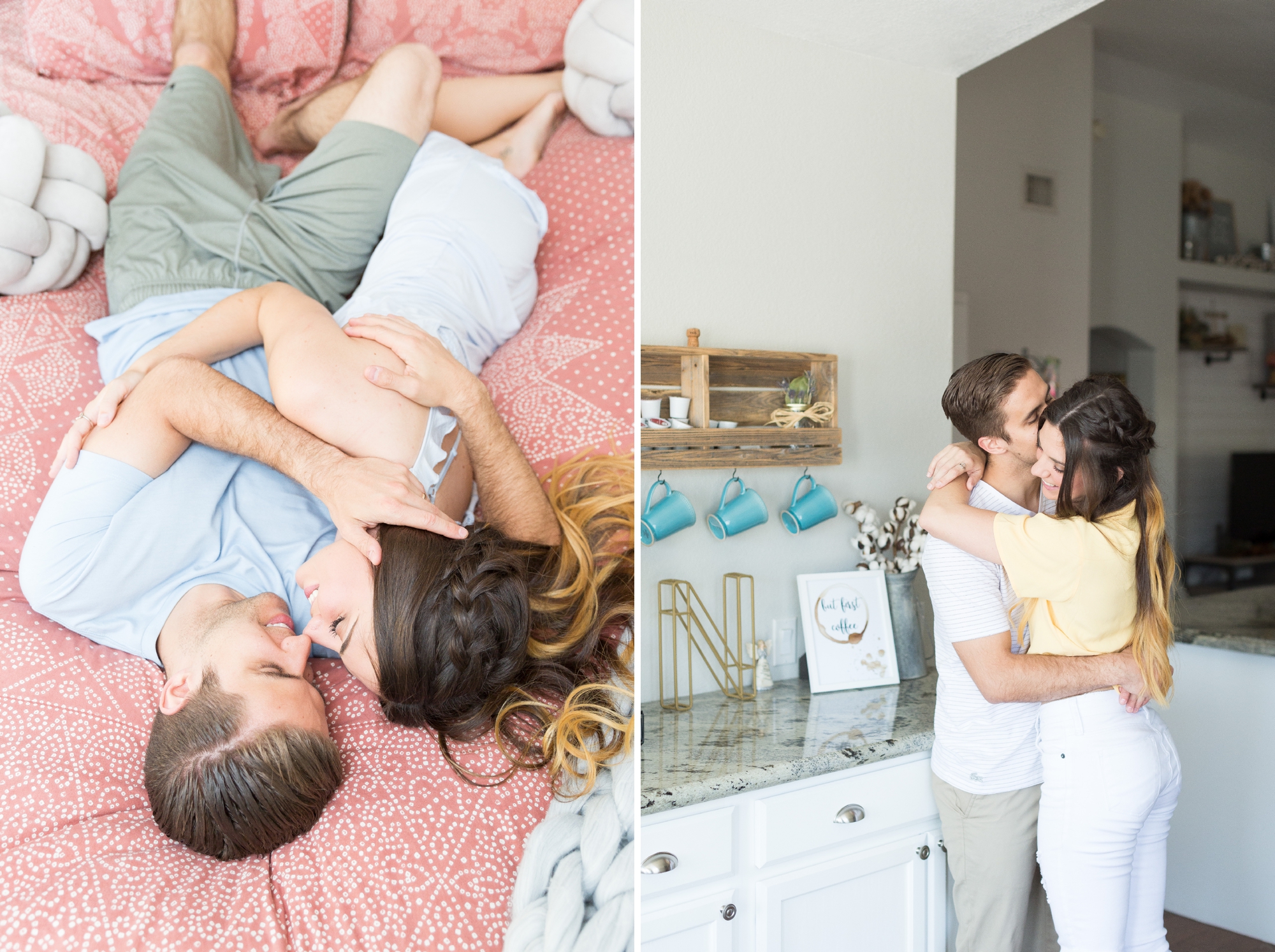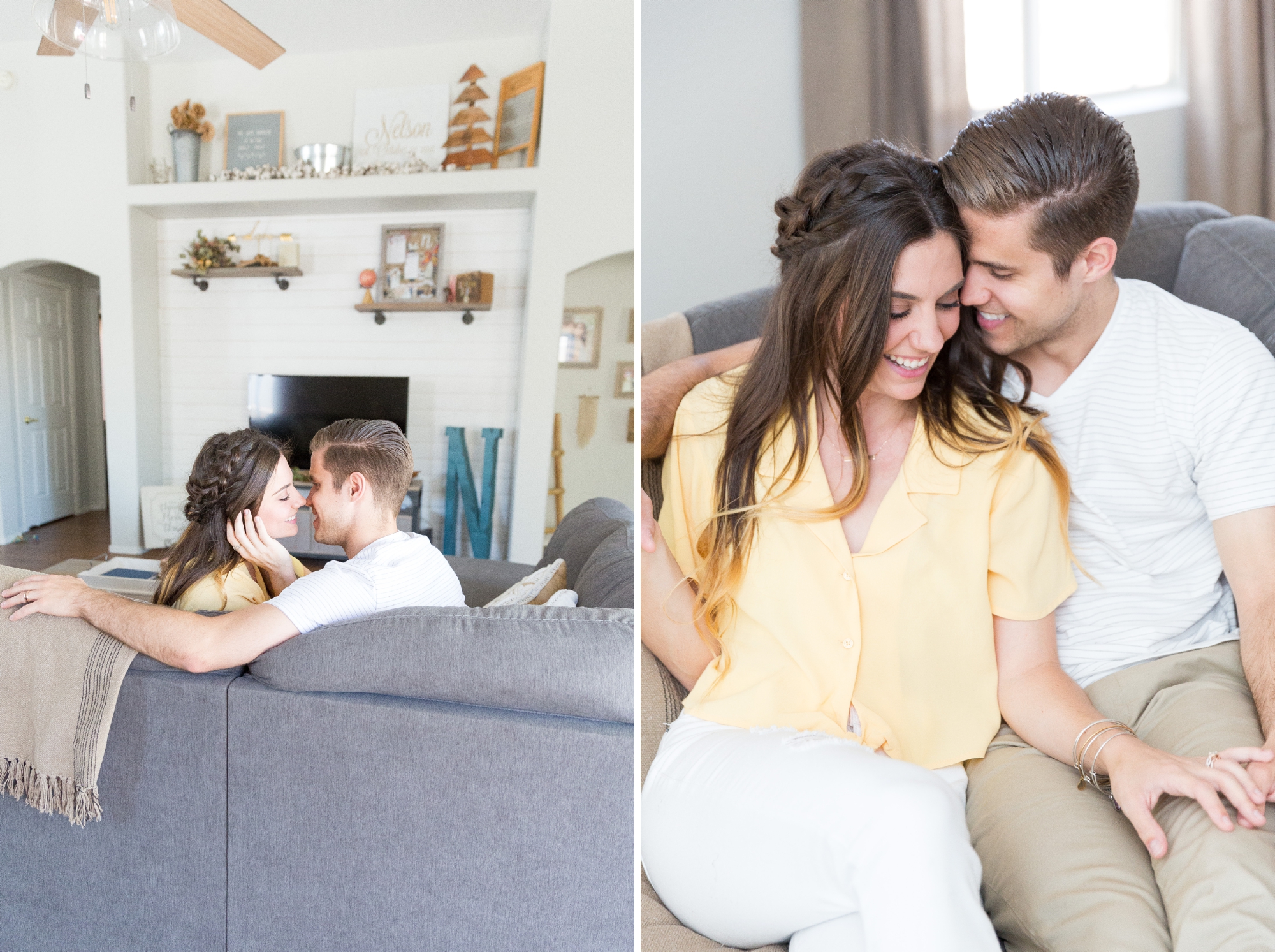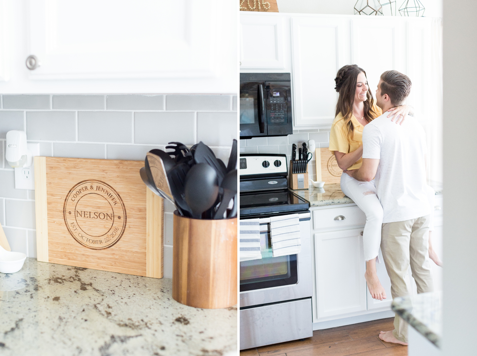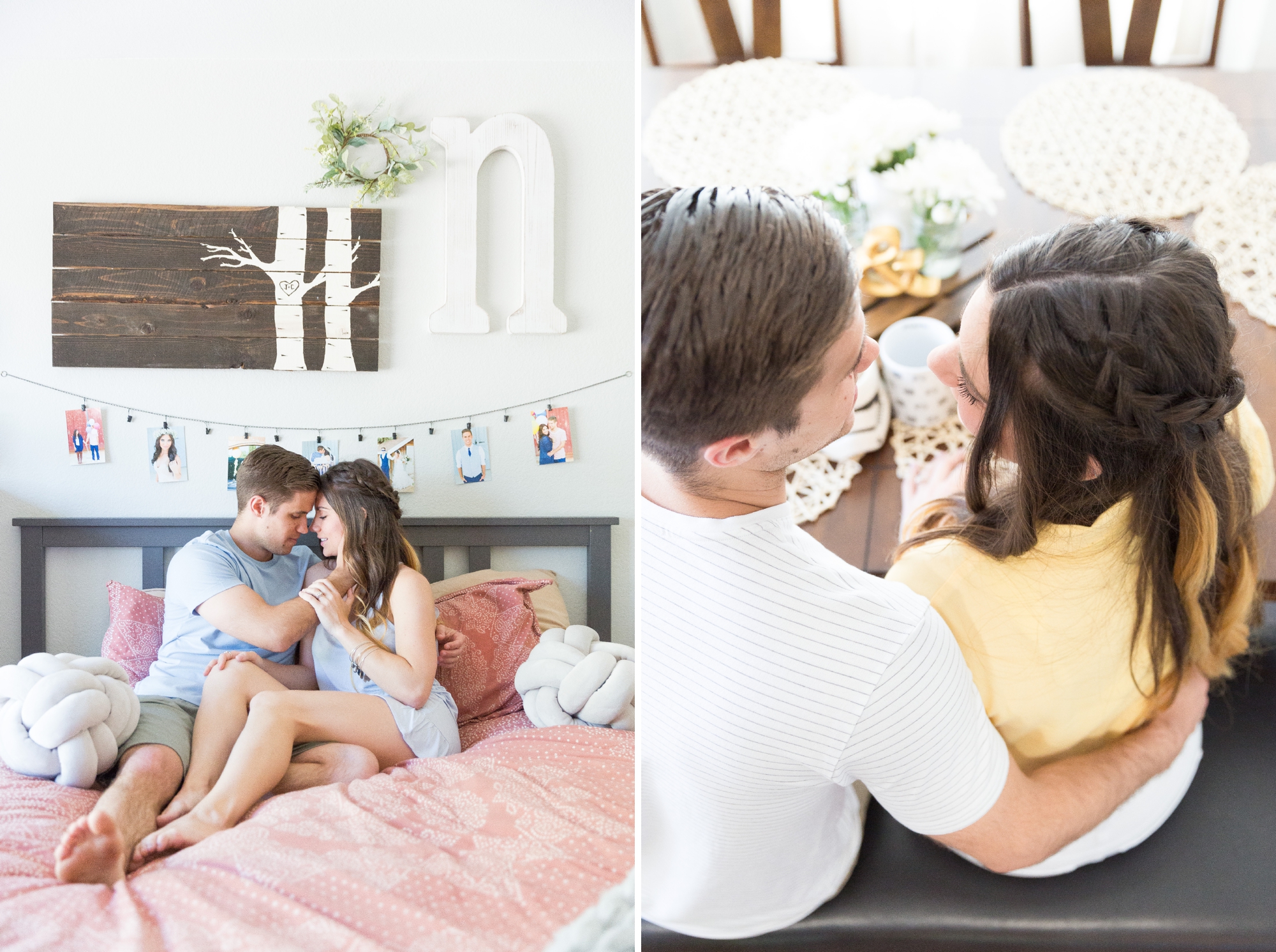 There’s something so intimate and special about creating memories in a home you share together. What makes those moments even sweeter? When they’re captured for you to remember forever, even when your hair is gray and your kids have a home of their own. The feeling of your bare feet on the hard wood, your cheeks touching as you relax on the couch, and the familiar grip of your favorite coffee mug in hand. I had the pleasure of capturing a small slice of Cooper and Jenny’s haven they call home, and it was so immensely sweet! I was lucky enough to photograph their engagement session and beautiful wedding, so this made my heart so incredibly happy. Seeing the photos I’ve already taken of them hanging on almost every wall reminds me that this is the ENTIRE REASON why I do what I do! *Happy sigh* I’m just obsessed with these two, and their kitties of course who behaved like little angels! The Nelson’s have created such a beautiful home together and their marriage is just beginning, with many adventures awaiting (just like Carl and Ellie)! So grab a fuzzy blanket and enjoy this cozy session inside their little piece of paradise!