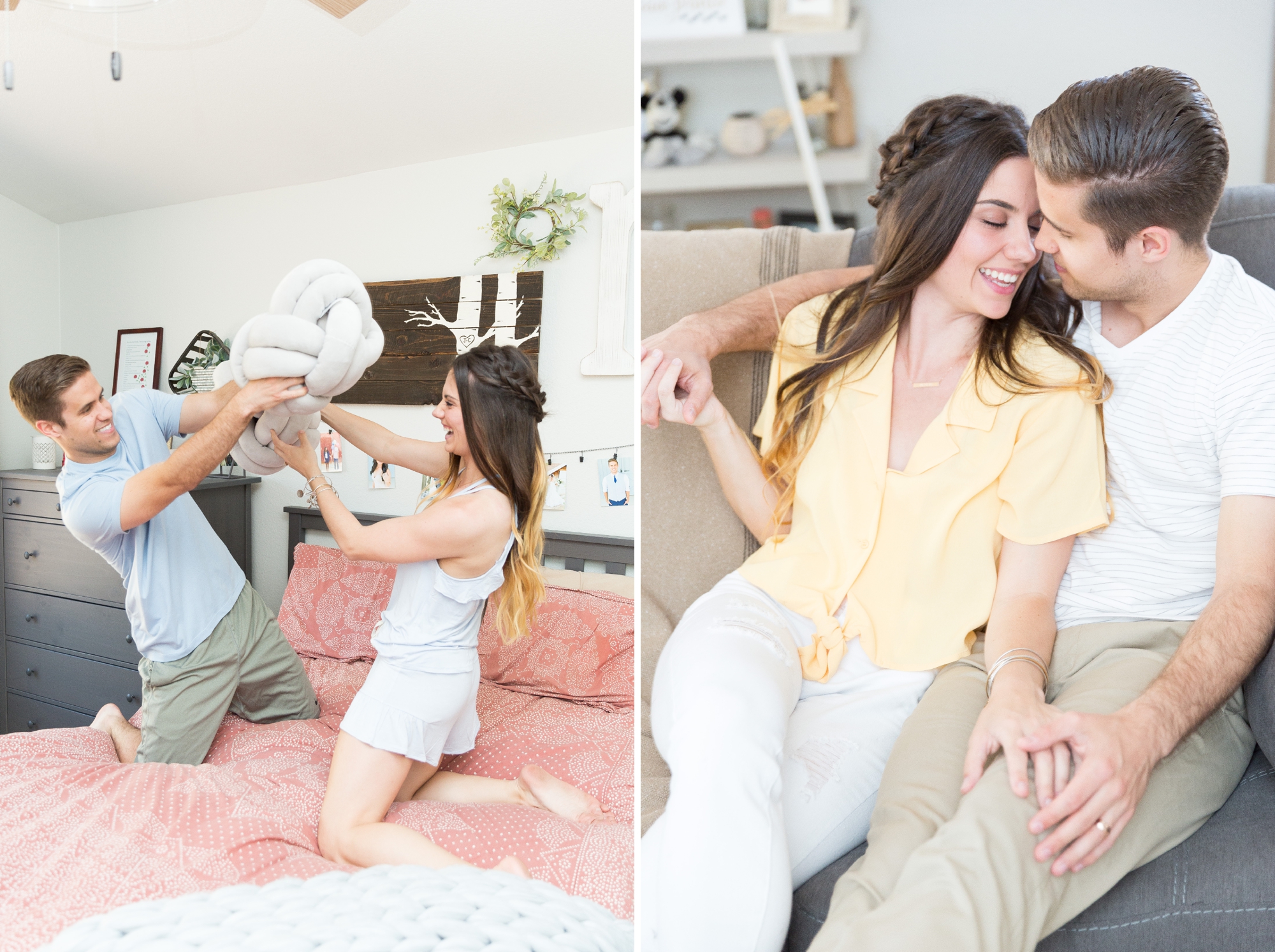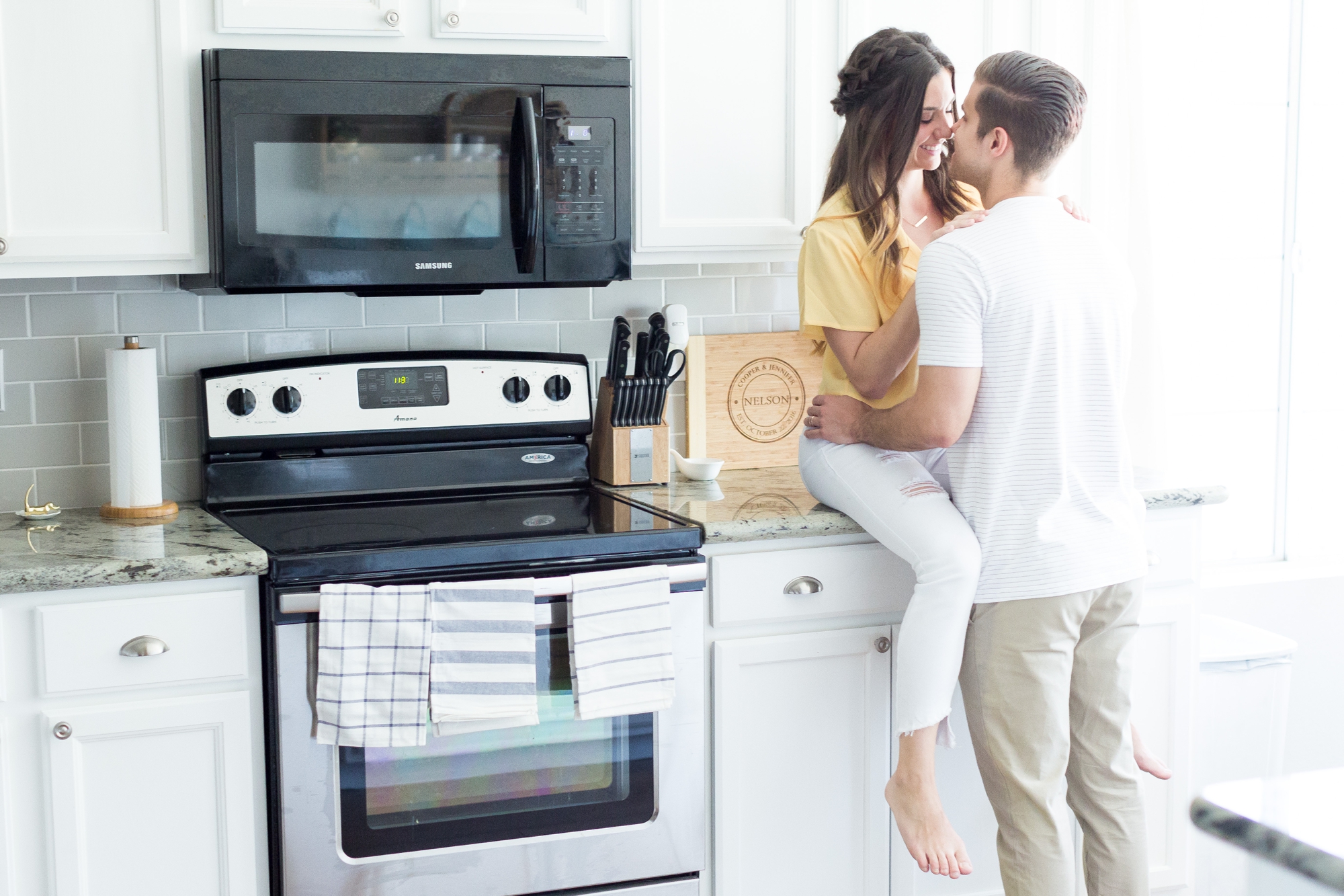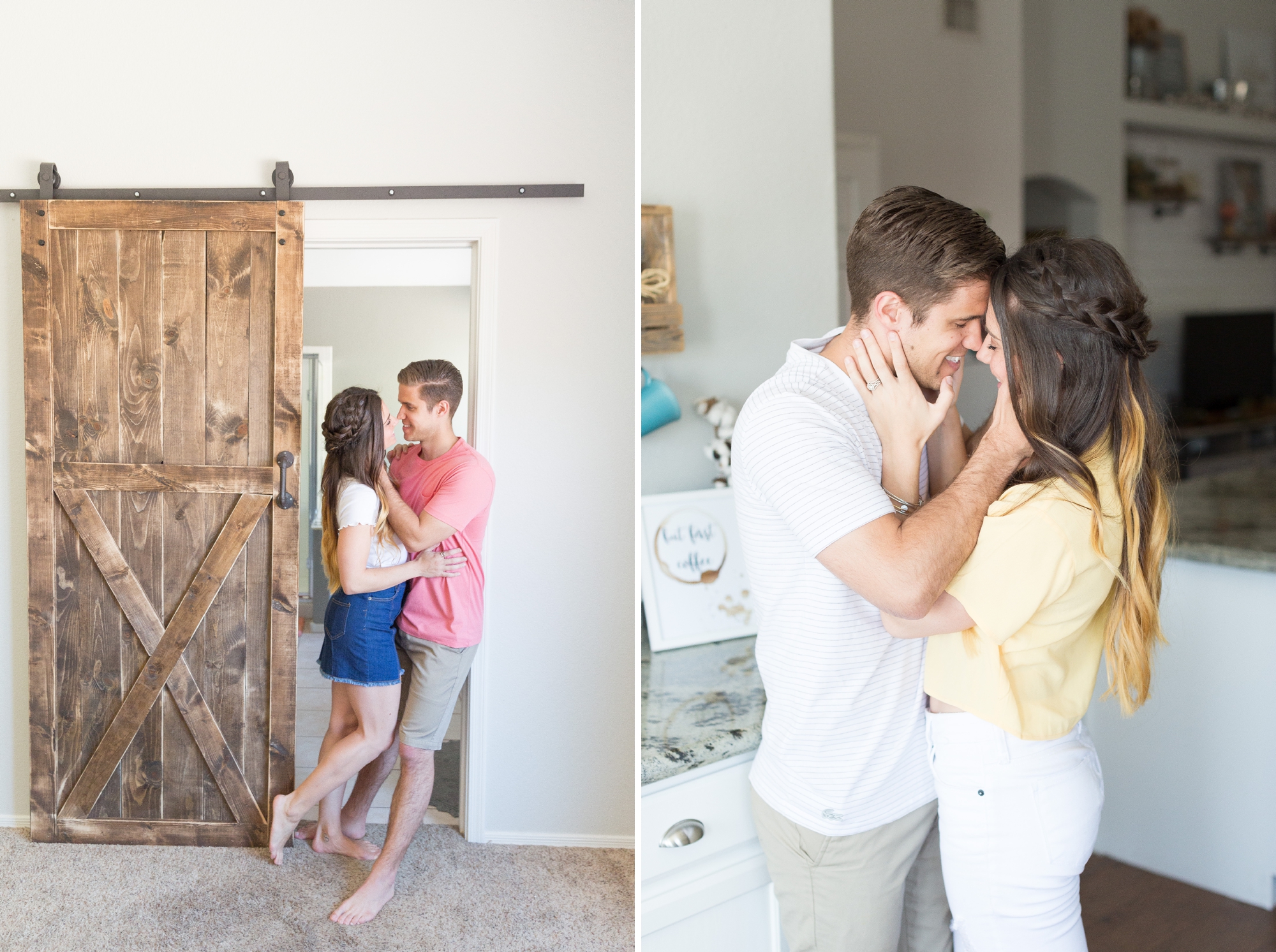 There’s something so intimate and special about creating memories in a home you share together. What makes those moments even sweeter? When they’re captured for you to remember forever, even when your hair is gray and your kids have a home of their own. The feeling of your bare feet on the hard wood, your cheeks touching as you relax on the couch, and the familiar grip of your favorite coffee mug in hand. I had the pleasure of capturing a small slice of Cooper and Jenny’s haven they call home, and it was so immensely sweet! I was lucky enough to photograph their engagement session and beautiful wedding, so this made my heart so incredibly happy. Seeing the photos I’ve already taken of them hanging on almost every wall reminds me that this is the ENTIRE REASON why I do what I do! *Happy sigh* I’m just obsessed with these two, and their kitties of course who behaved like little angels! The Nelson’s have created such a beautiful home together and their marriage is just beginning, with many adventures awaiting (just like Carl and Ellie)! So grab a fuzzy blanket and enjoy this cozy session inside their little piece of paradise!