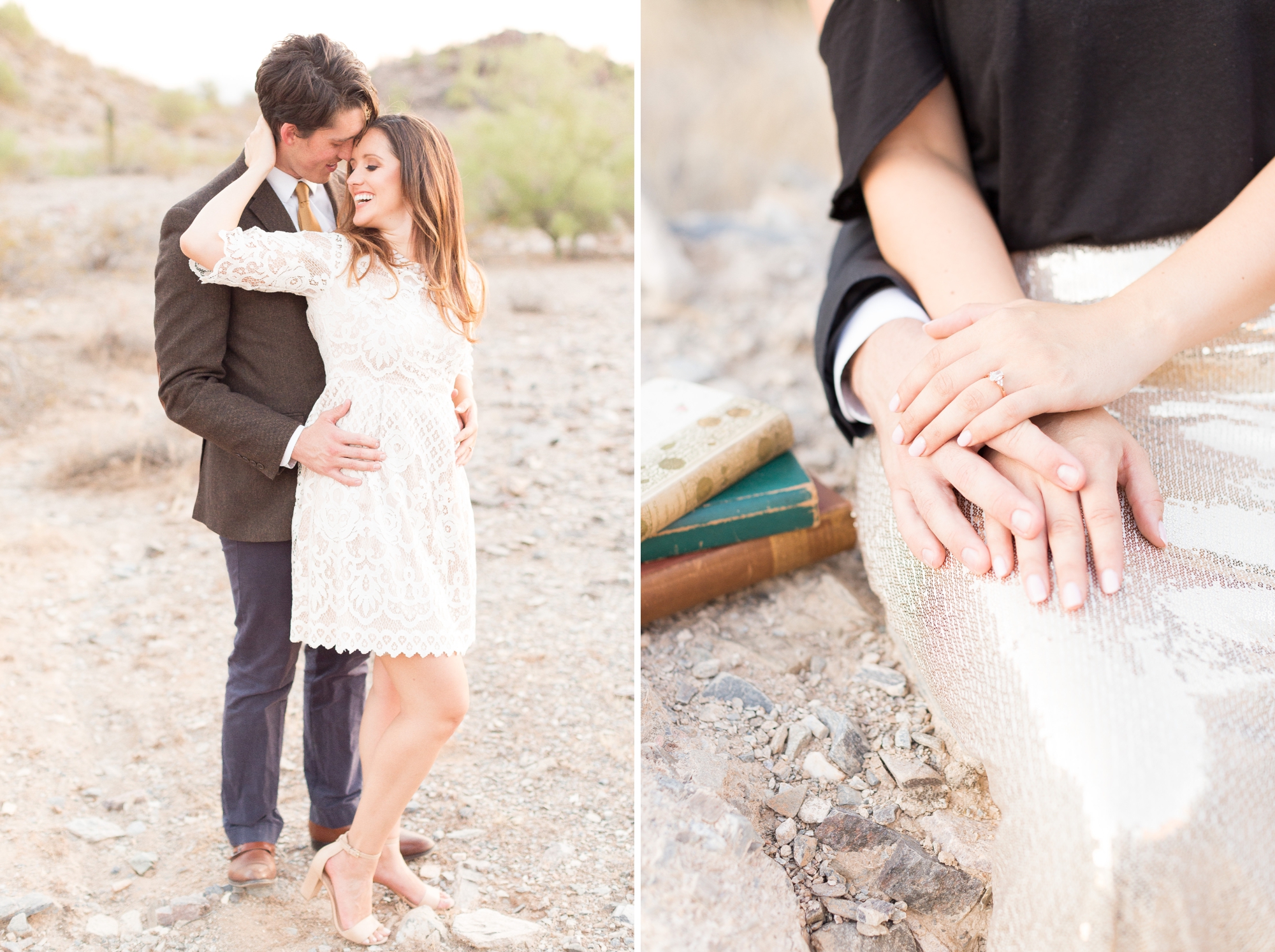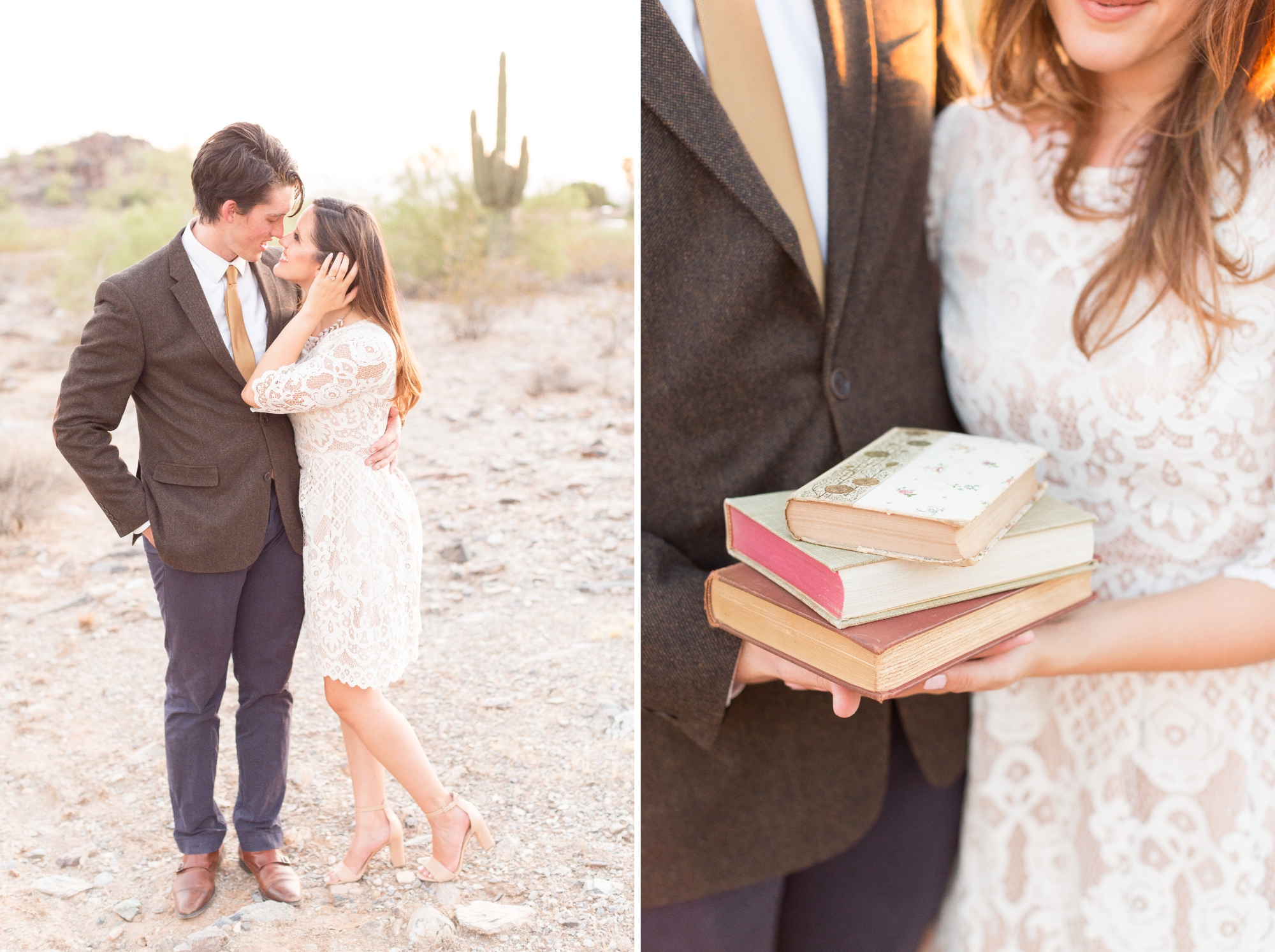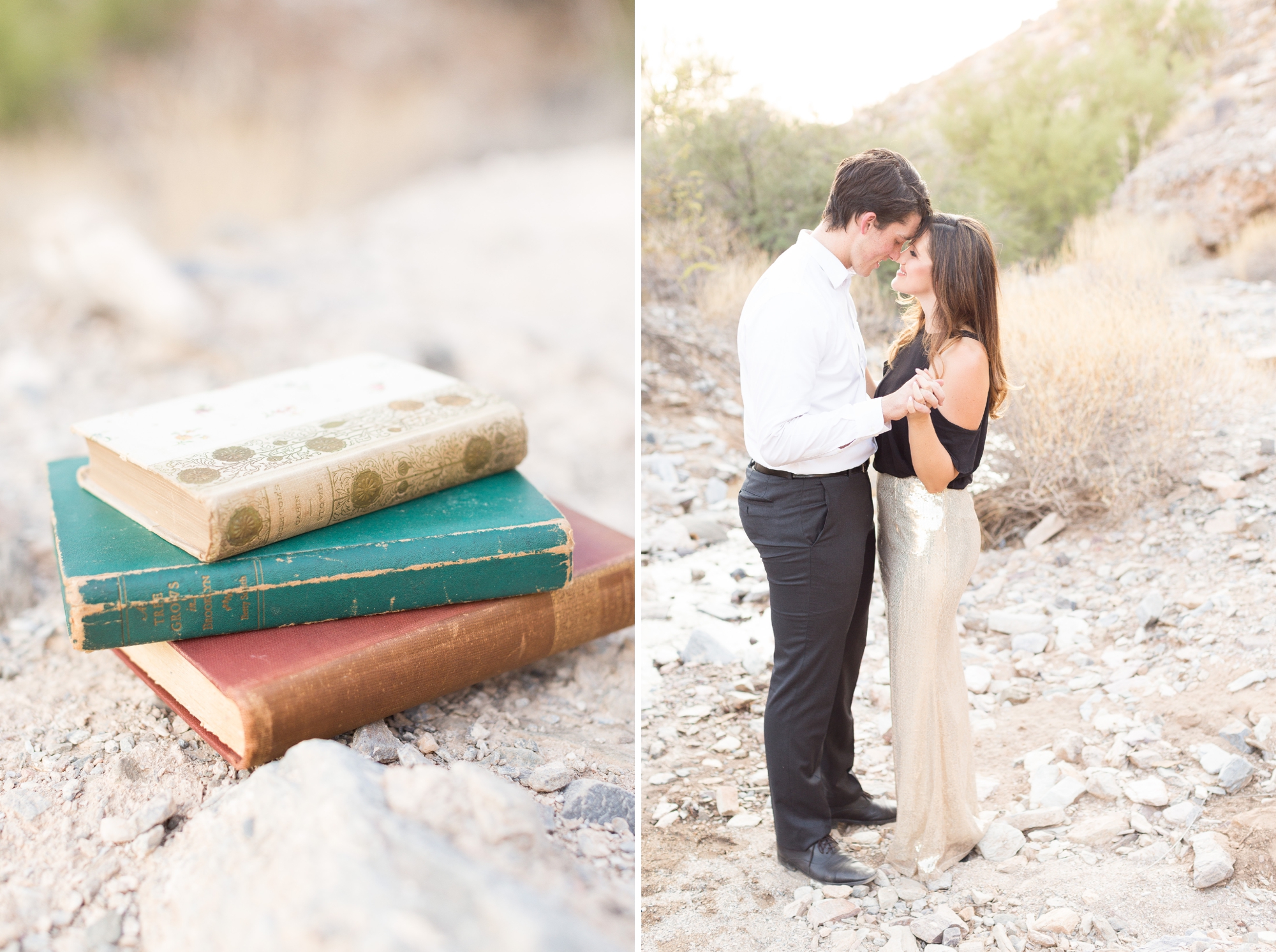 Fast forward a few months to a warm, sunny October evening where they walked carefully over boulders and through trickling streams as we shot their engagement session. Courtnee’s shimmering gold skirt danced around her ankles with every step she took, while Isaac brushed back his hair as he snuck glances of his soon-to-be bride. We laughed and shot around the desert trails of Piestawa Peak, even snagging shots with vintage books they had brought that belonged to her grandmother! So sweet! And as the sun sank low and casted a golden glow on everything it covered, they danced as if no one was around to end the most perfect evening. And every step they took together was so beautiful for me to witness, because Courtnee’s story is absolutely incredible, and she didn’t know if she would ever be able to dance with her husband one day.