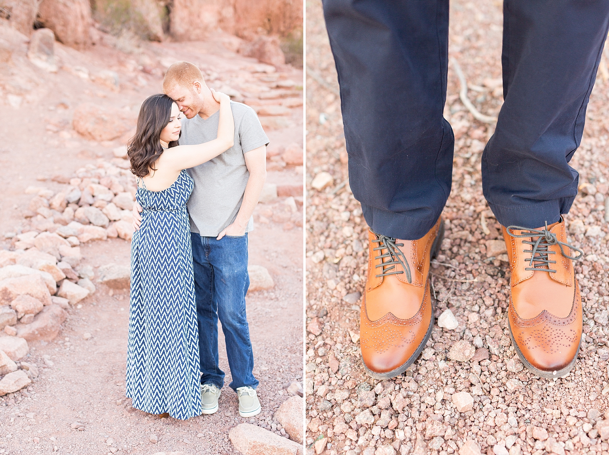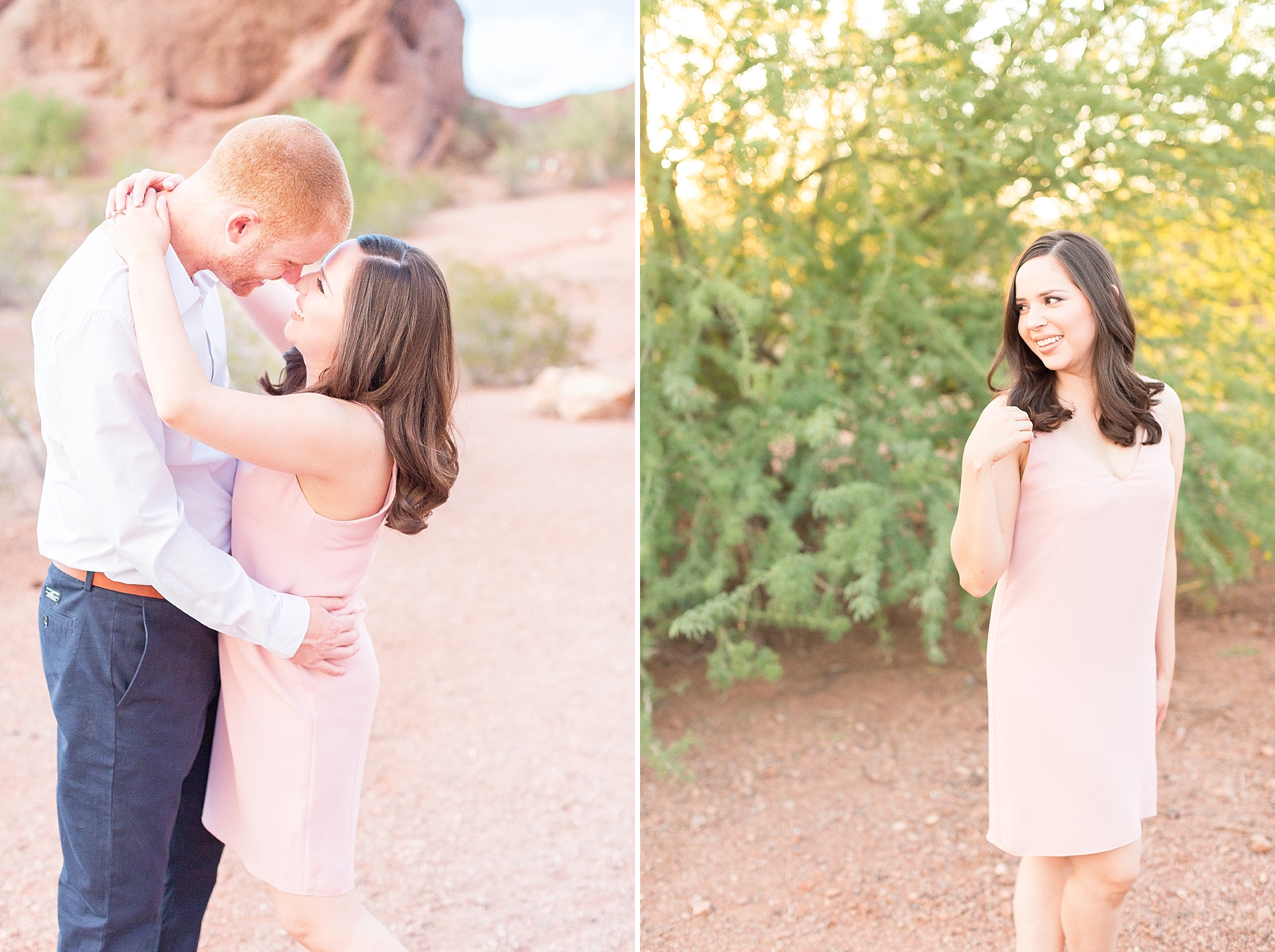 The sun hid behind fluffy, purple clouds while the breeze fluttered through her soft, blush dress. We walked carefully through the path, her champagne-colored heels sinking with every step, holding his hand tight. They turned to face me, the red cliffs standing tall behind them, and I sighed with gratitude as our session had been so wonderful. But this sight of Joseph and Adrianna with the dark clouds carrying a dust storm behind them was magic, and I couldn’t have thought of a better way to end our engagement session in the Arizona red rocks. They kissed and giggled as they held each other close, dipping her so her dark hair hung off her shoulders, taking in the last moments of this once-in-a-lifetime experience. These exciting times when she still isn’t used to wearing a ring on that finger, and they plan the beginning of the rest of their lives together..