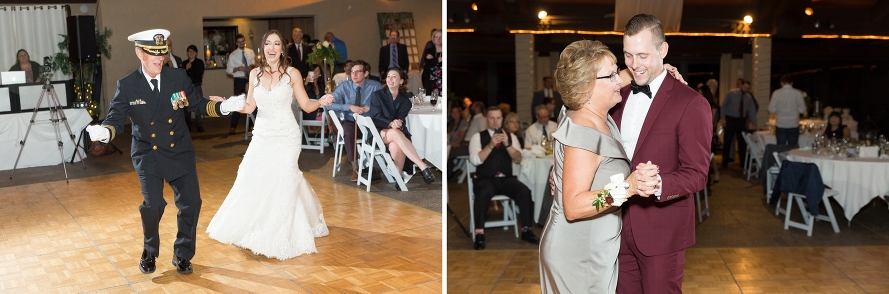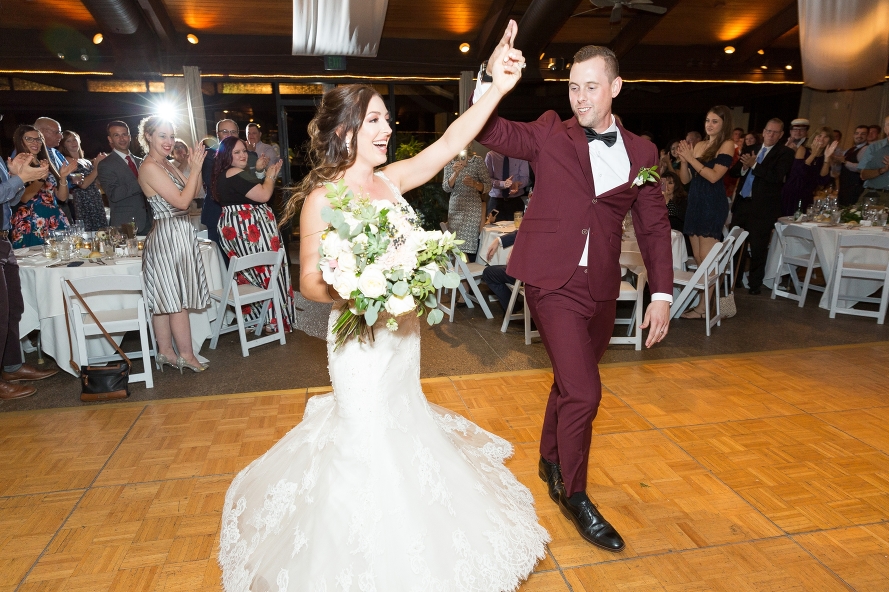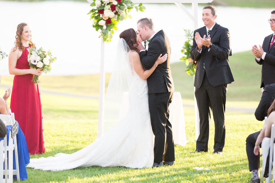 The light reflected off the water behind them as the sun peeked in and out for the clouds, slowly dipping lower behind the purple mountains. The breeze rustled through the flowers held by every bridesmaid, contrasting their burgundy dresses so perfectly on this first weekend in October. Tracy and Kyle held onto their white vow books in front of everyone they loved more than anything, and each read their personal promises to each other through tears. This moment was so beautiful, my favorite of the day, not just because these two shared the most beautiful words. I loved this memory mostly because I caught a glimpse of Tracy and Kyle’s moms watching in the front row, listening to the profound words of someone who cares for their child in a way they could have only prayed for. I continuously pray for my daughter’s future spouse, so seeing their mom’s sweet faces as they listened was so touching as their dreams for their baby’s futures were confirmed in front of their eyes. And when these newlyweds sit in the front row at their kids’ weddings one day, I know they will yearn for vows like these to be meant from the bottom of both party’s hearts, and it will bring them so much joy.