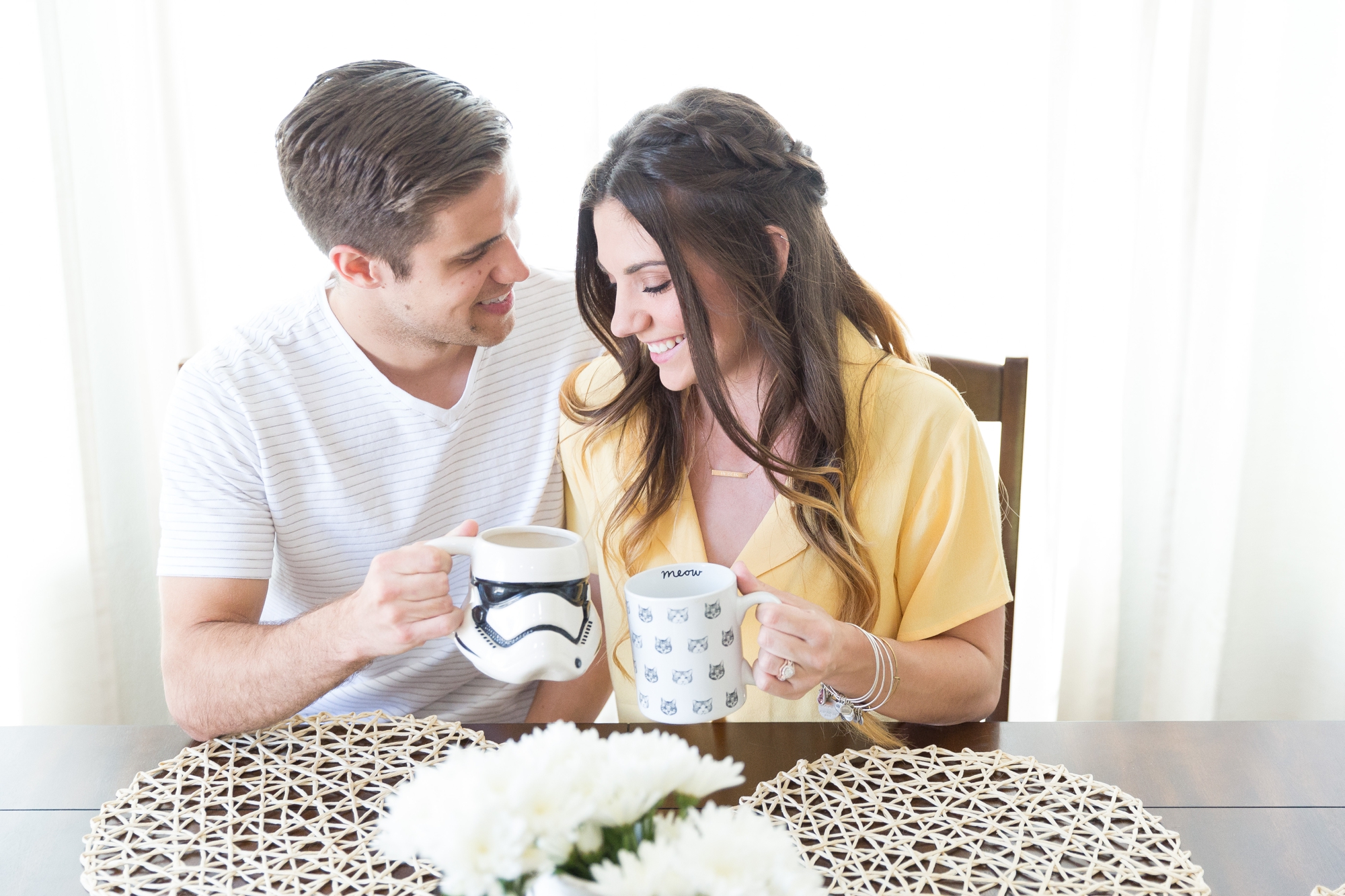 There’s something so intimate and special about creating memories in a home you share together. What makes those moments even sweeter? When they’re captured for you to remember forever, even when your hair is gray and your kids have a home of their own. The feeling of your bare feet on the hard wood, your cheeks touching as you relax on the couch, and the familiar grip of your favorite coffee mug in hand. I had the pleasure of capturing a small slice of Cooper and Jenny’s haven they call home, and it was so immensely sweet! I was lucky enough to photograph their engagement session and beautiful wedding, so this made my heart so incredibly happy. Seeing the photos I’ve already taken of them hanging on almost every wall reminds me that this is the ENTIRE REASON why I do what I do! *Happy sigh* I’m just obsessed with these two, and their kitties of course who behaved like little angels! The Nelson’s have created such a beautiful home together and their marriage is just beginning, with many adventures awaiting (just like Carl and Ellie)! So grab a fuzzy blanket and enjoy this cozy session inside their little piece of paradise!