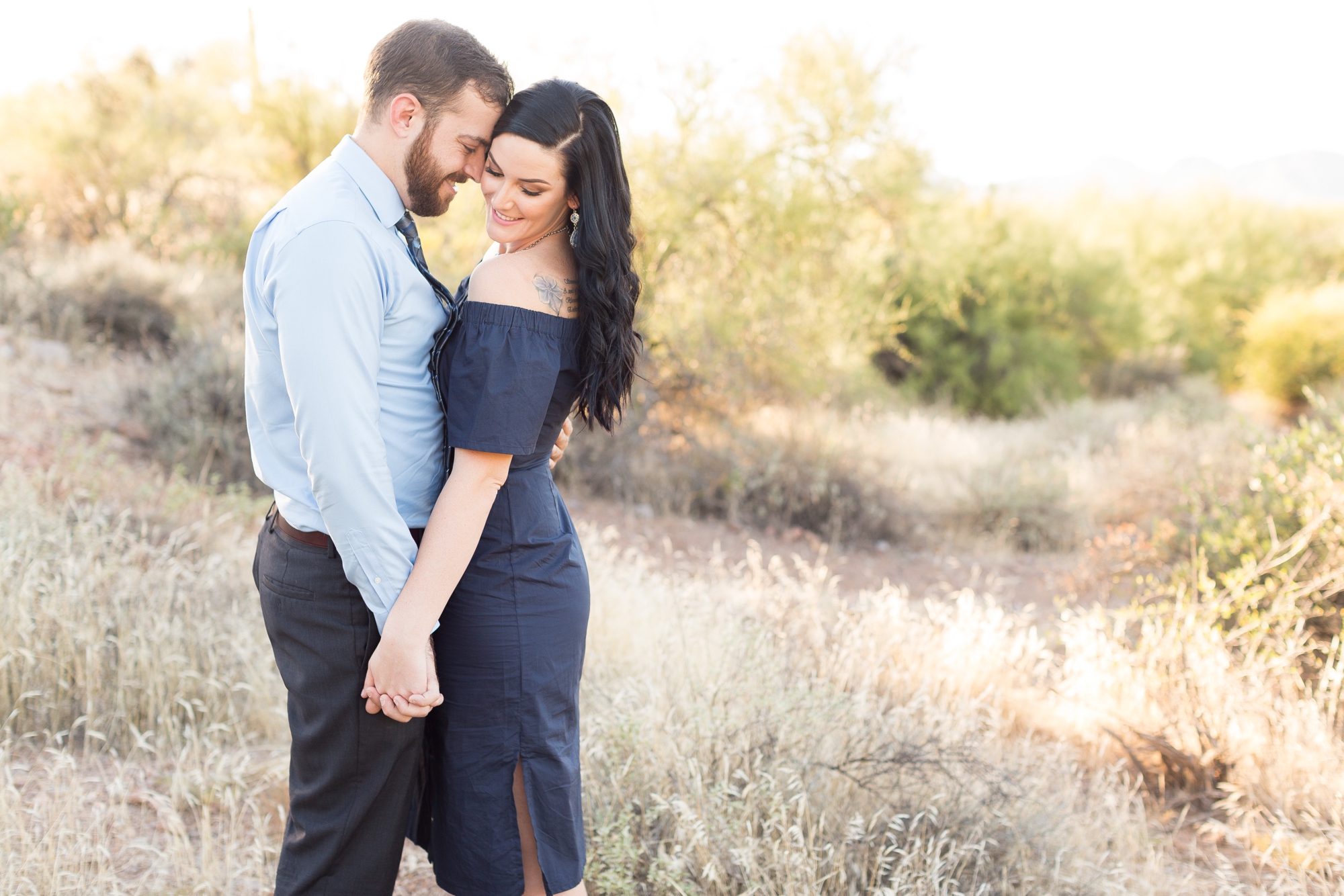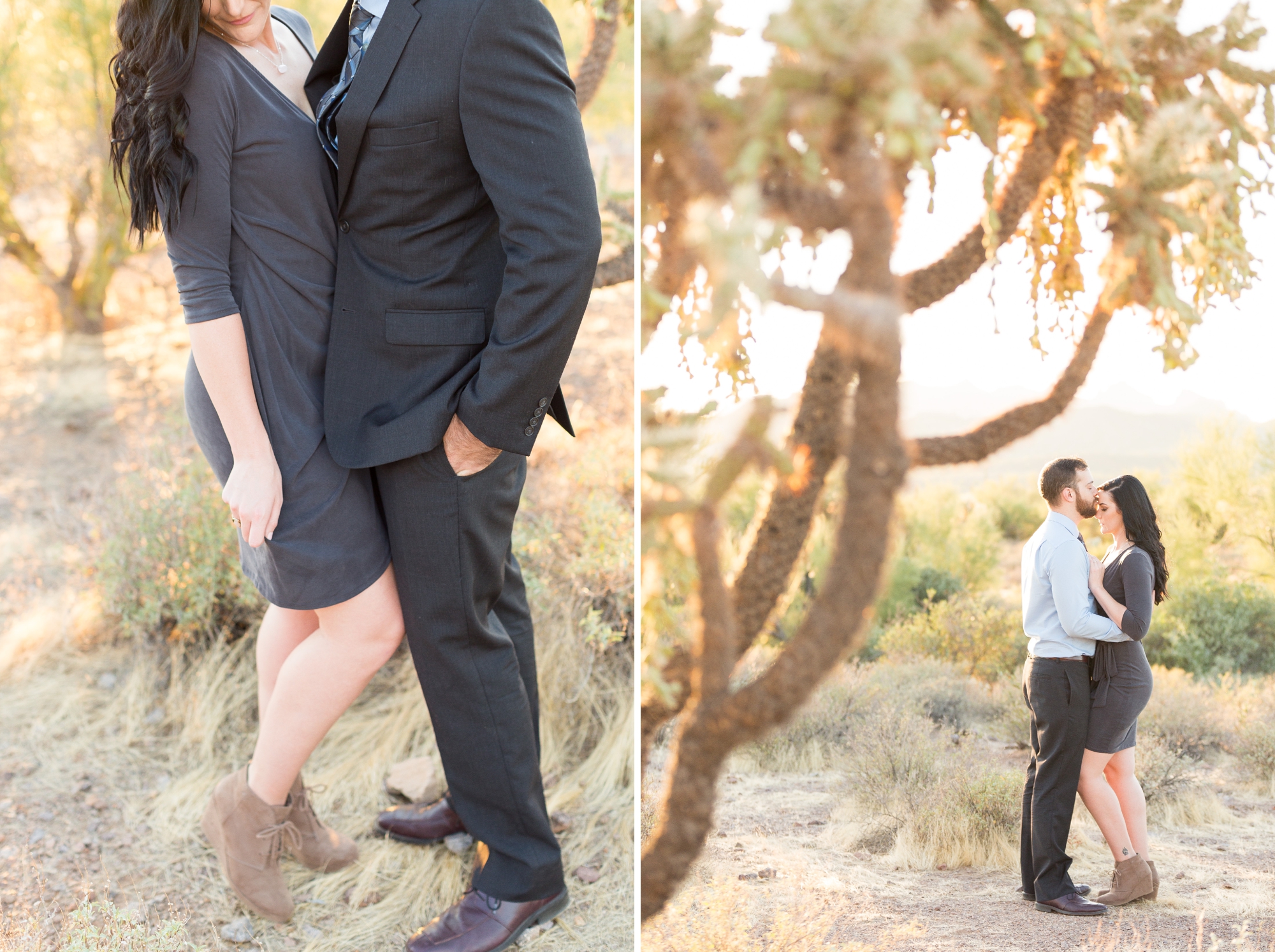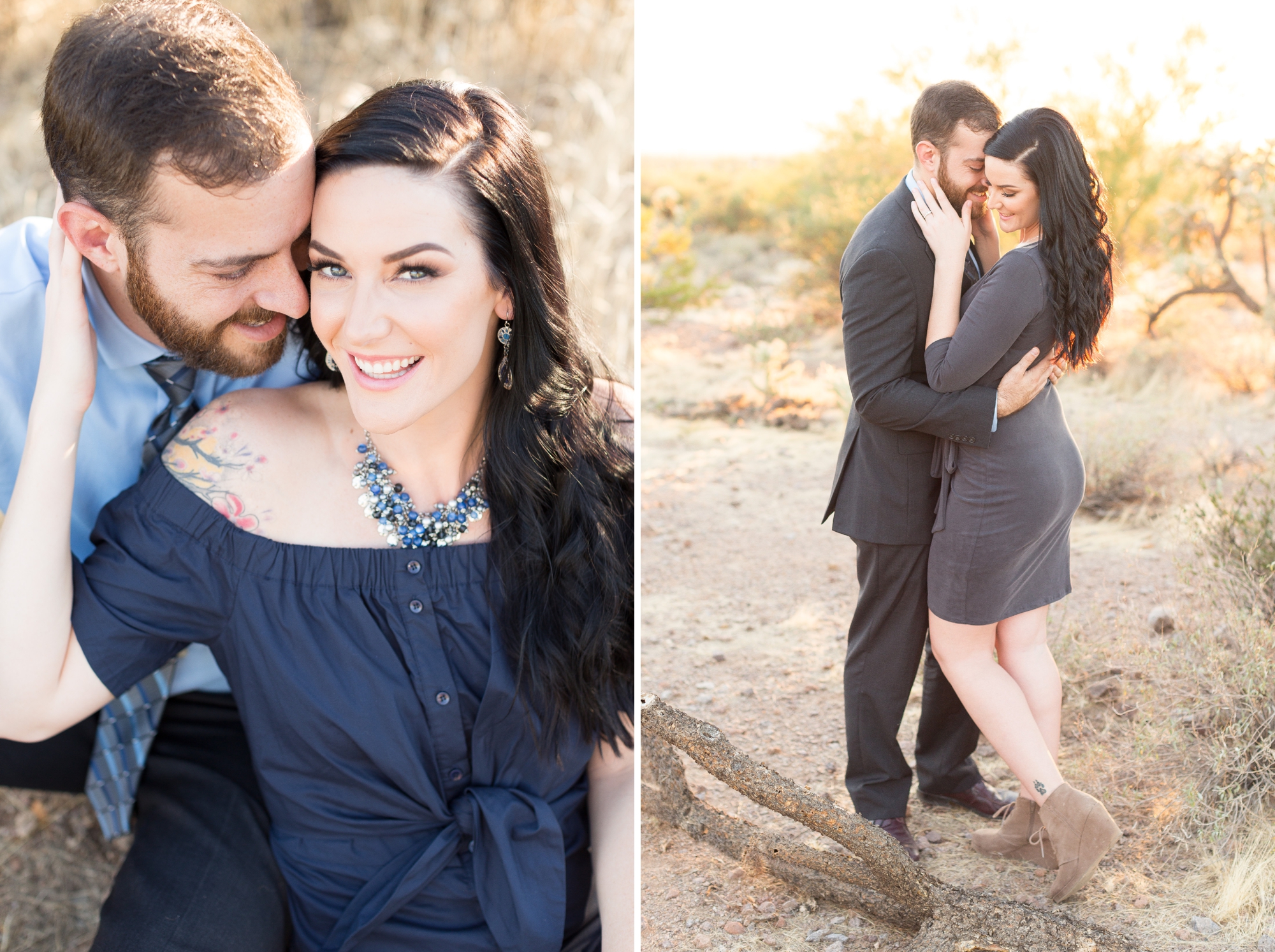Kara and John’s engagement session was so incredible, not only because they are two of the sweetest people I’ve ever met, but because they are SO natural in front of the camera! Their love emulates in every way as they hold one another, and their eyes light up so elatedly every time they look at each other. As you can imagine, this made my job so incredibly easy! We stepped through the gravel, kicking up dust and keeping cool in the shade as the sun sank lover over the horizon, giving every cactus a golden halo and a dazzling glow to everything it touched. The desert floor was blanketed in yellow, and her dark hair popped against the orange sunset. We stepped through the harsh desert landscape, avoiding cholla needles, ants, and a snake (the very first time I’ve seen one on a shoot), but you would never know from how these two rocked out their session! I can only guess how stunning their desert wedding is going to be next year, and I’m so extremely thankful to be a part of it! Here’s to creating many more moments many that give these places a special memory, and to more sunsets together for the rest of your lives!