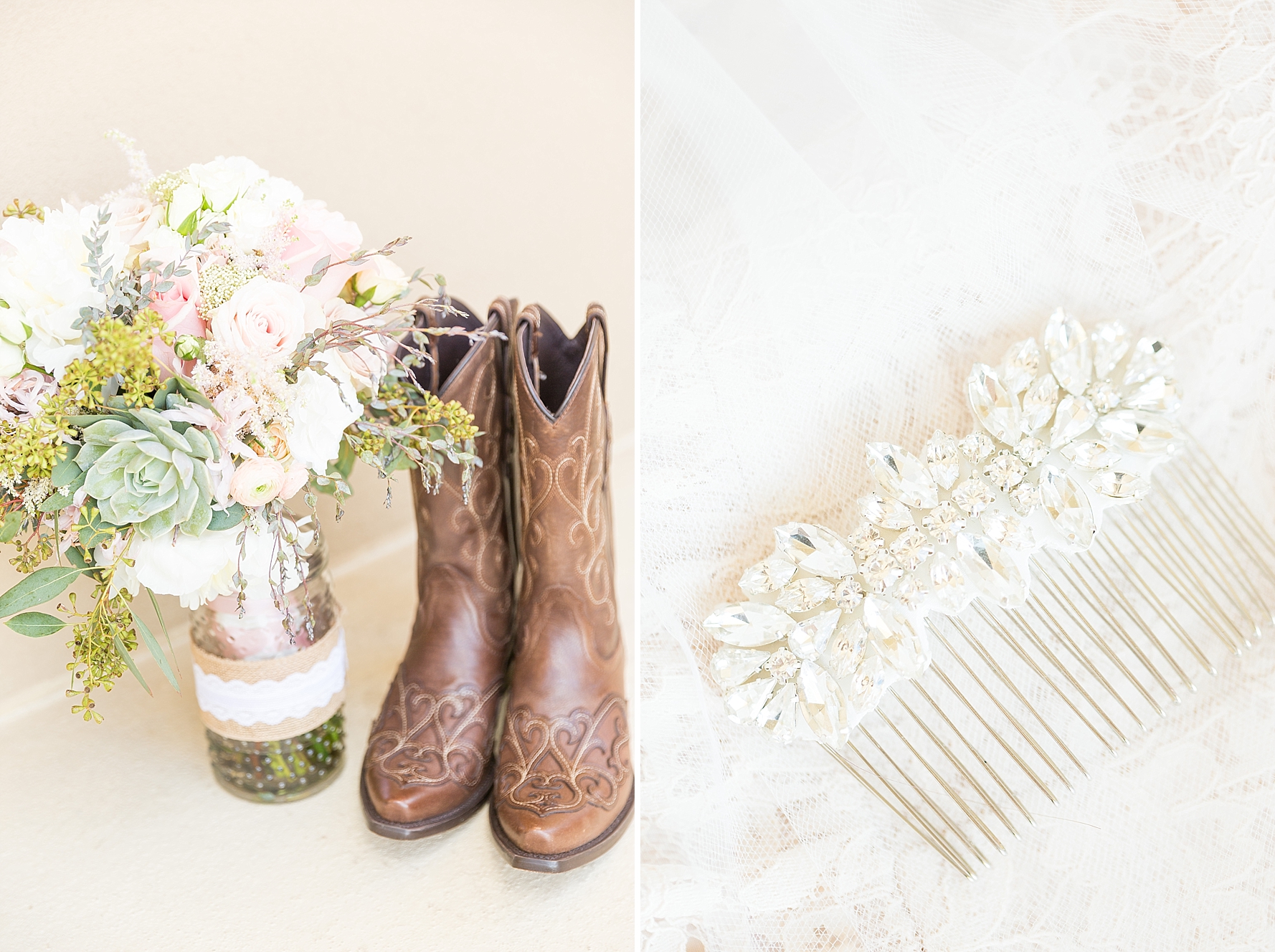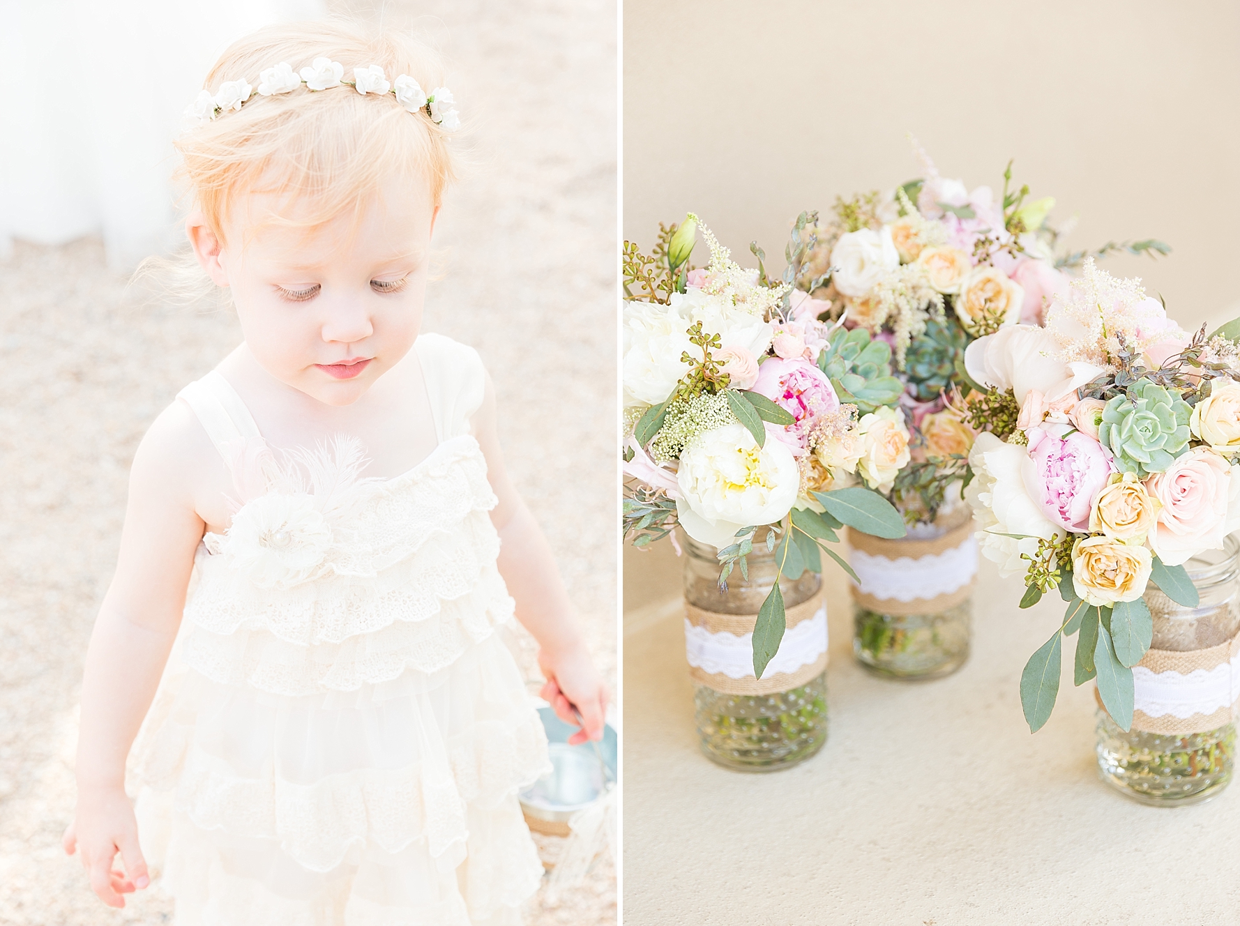 Austin and Kirsten’s soft desert wedding was an absolute dream, in so many beautiful ways. Their day was filled with so many special details, from their “fur baby” walking down the aisle, to a special dance to honor her grandparents’ long, thriving marriage. I was enamored with every carefully thought-out detail, and blown away by the florals hand-made by the groom’s mother! I mean, look at the talent and love that was poured into each sweet arrangement! When I walked into the barn, I could smell the perfume that every centerpiece produced, and every table was stunningly arranged by the talented ladies of Sip and Twirl. From flickering tea lights and mercury vases, to the glimmering lights that dripped from the ceiling, it was as whimsical as it was elegant. The moment the double barn doors opened, an entranced sigh arose from the guests as they made their way to their seats. And I couldn’t help but smile, knowing all the work and love that went into that reaction. Not to mention the sweet little beer burro, Diego, who walked around cocktail hour toting cold beer for their guests! I squealed with excitement as the little spotted donkey made his way toward us, and even more excited when I fed him a carrot. Cutest. Donkey. Ever.
