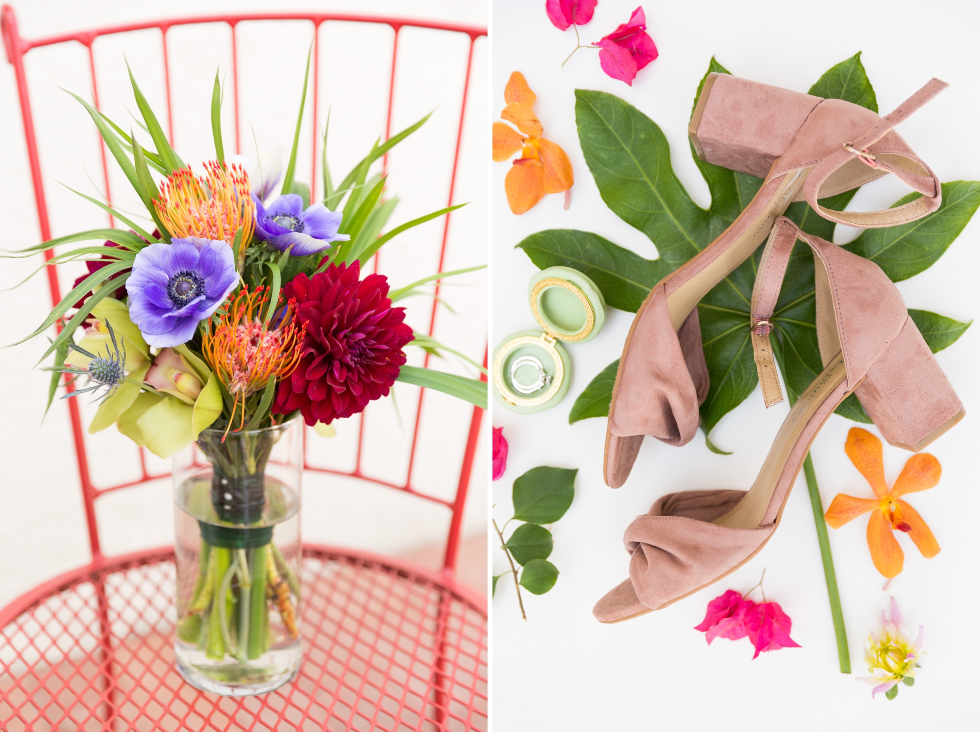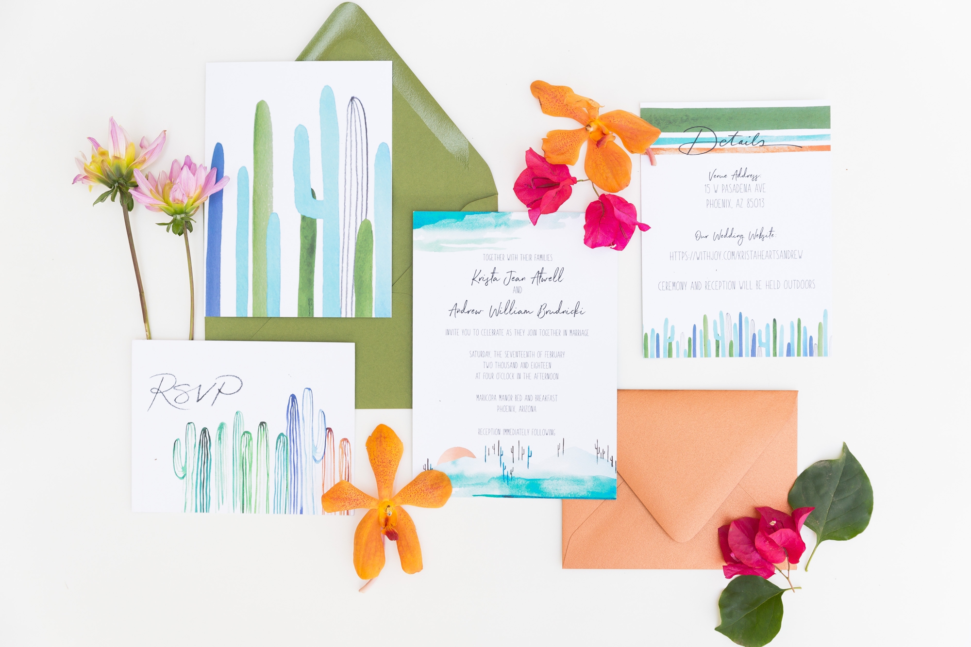 Knowing Krista and Andrew after meeting them for their engagement session makes me feel like I have know them for so much longer! They’re the type of people who are so down to Earth and just easy to be friends with, and capturing their love has been such an honor. Coming all the way from California, this beautiful Arizona weather didn’t disappoint! With bright colors in every detail and tropical flowers throughout, this boho-inspired day was so uniquely beautiful! I felt like we were in Palm Springs, say for the cutest quails painted on the custom invitation suite that embodied Arizona perfectly! The geometric ceremony backdrop carried the boho theme to the next level, where ladies in green and men in blue stood as the couple tied the knot. It was absolutely gorgeous, and I can’t wait for Krista and Andrew to continue in their journey as husband and wife. Congratulations you two, here’s to many more beautiful years to come!